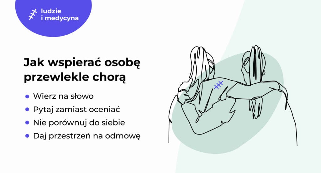 • Nie porównuj do siebie. „Ja też jestem zmęczony” (nawet jeśli powiedziane z dobrą intencją) pogłębia lukę zamiast ją zamykać. Twoje zmęczenie i zmęczenie osoby przewlekle chorej to różne doświadczenia, nawet jeśli nazywają się tak samo.